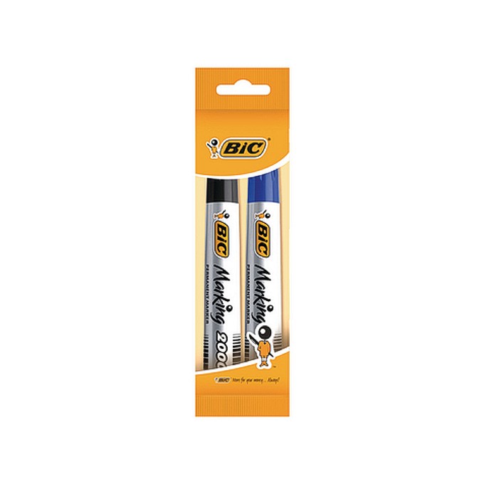 Marker Permanent cu vârf rotund. Pachetul conține două markere; negru și albastru.