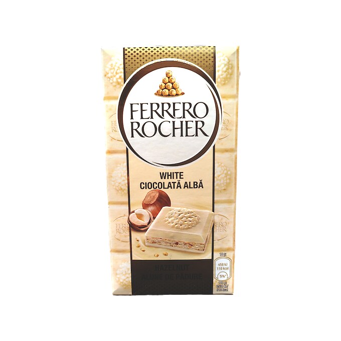 Ciocolată albă Ferrero Rocher, 90 g - Varianta specială Ferrero Rocher în formă de tabletă, cu ciocolată albă cremoasă (60%) și umplutură generoasă (37%) cu cremă fină de alune de pădure (hazelnut) și bucăți întregi/mărunțite de alune prăjite. Fiecare dintre cele 5 bucăți reproduce fidel gustul și textura clasică a bomboanelor Ferrero Rocher, dar cu ciocolată albă în loc de ciocolată cu lapte/neagră – rezultând un gust mai dulce, mai fin și mai lactat, cu aromă intensă de alune prăjite. Textură contrastantă: exterior mătăsos de ciocolată albă + interior crocant-fin cu nuci. Perfectă pentru iubitorii de Ferrero Rocher care preferă ciocolata albă sau doresc o experiență mai dulce și mai cremoasă.