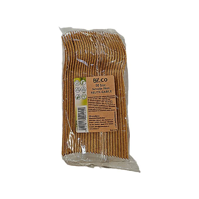 Furculițe reutilizabile Bioco 18 cm (pachet 50 bucăți) sunt tacâmuri ecologice fabricate din material biocompozit pe bază de lemn - WPC, destinate contactului cu alimente și băuturi, calde sau reci. Aceste furculițe sunt robuste, reutilizabile și reprezintă o alternativă sustenabilă la tacâmurile de plastic de unică folosință, ideale pentru petreceri, picnicuri, evenimente sau uz zilnic.